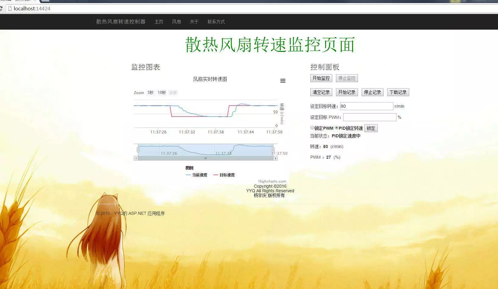 C#这门语言的疯狂热情,用了一个多星期的时间学完HTMLCSSJavaScriptAjaxBootstrapJQuery以及ASP.NET,成功做出了人生第一个网站,并且用了几天时间,慢慢接触WebFormEntityFrameworkMVC框架,以及最重要的SignalR,打破了HTTP协议无状态的缺陷,实现了网页版的上位机,能够在网页上对单片机进行PID调节、风扇转速测量,并且绘图速度很快。