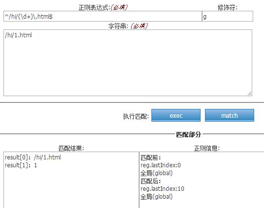 上述正则表达式表示匹配 /hi/任意数字.html 这样的URL,其中的(\d+)括号( )表示括号内的字符串作为一个新的子字符串返回,那么表达式的匹配结果里就会有两个结果: