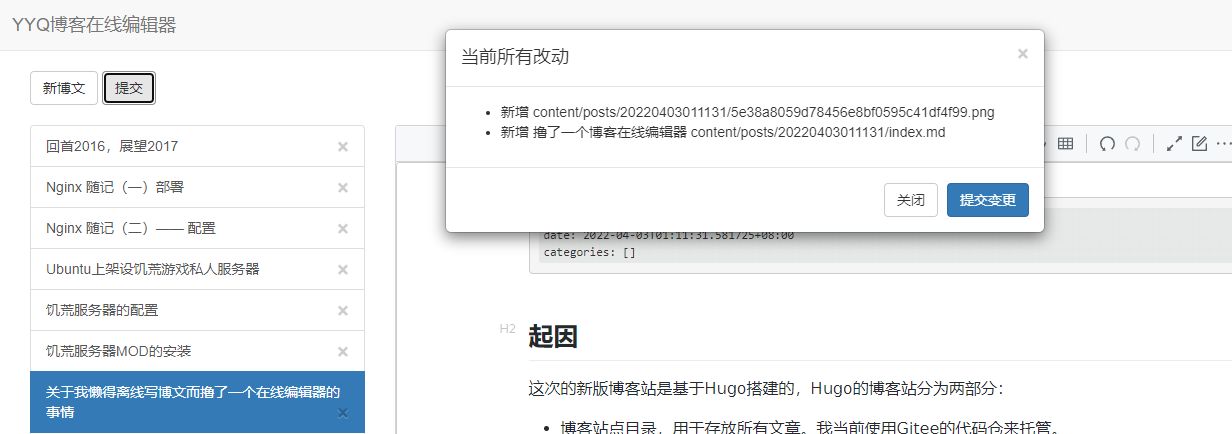 当点击提交变更后,会自动进行git commit,git push,然后调用自定义脚本重新生成站点,一步到位,马上就可以在hiyyq.cn博客主页上看到新文章了,爽死了。