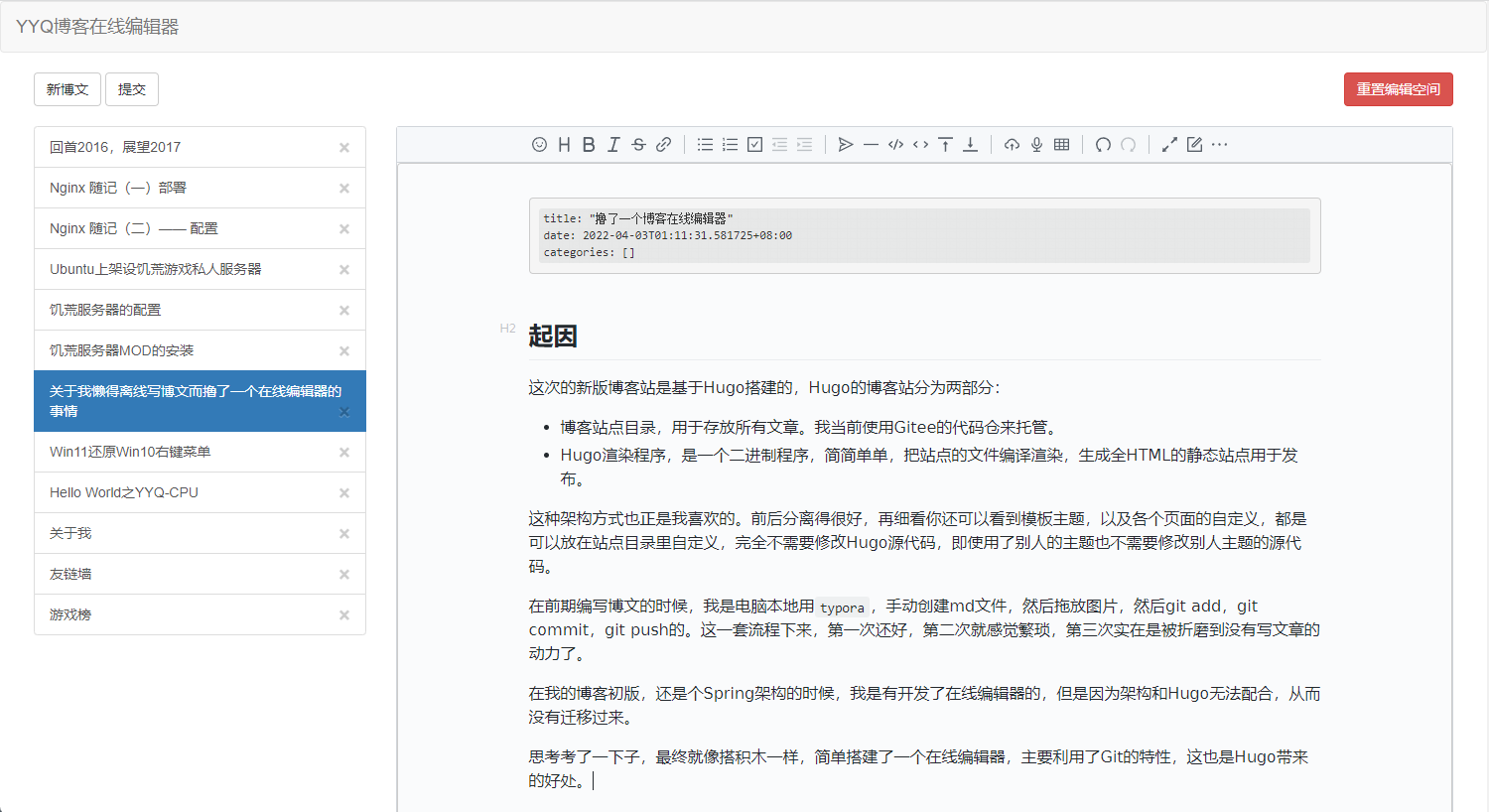 在我的博客初版,还是个Spring架构的时候,我是有开发了在线编辑器的,但是因为Spring架构和Hugo无法配合,从而没有迁移过来。