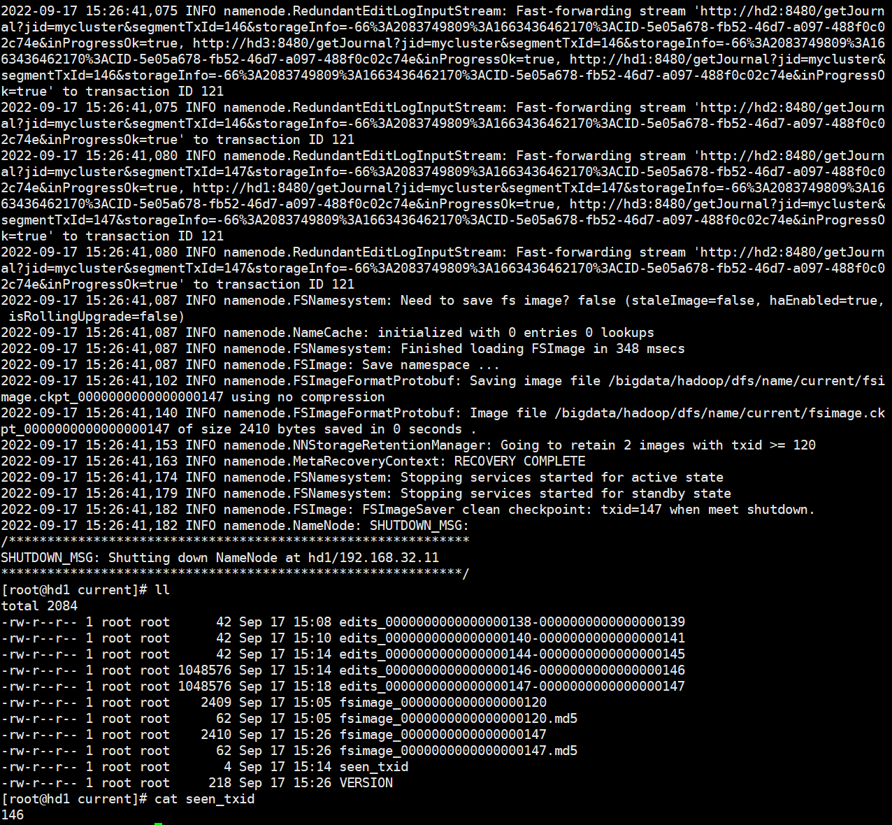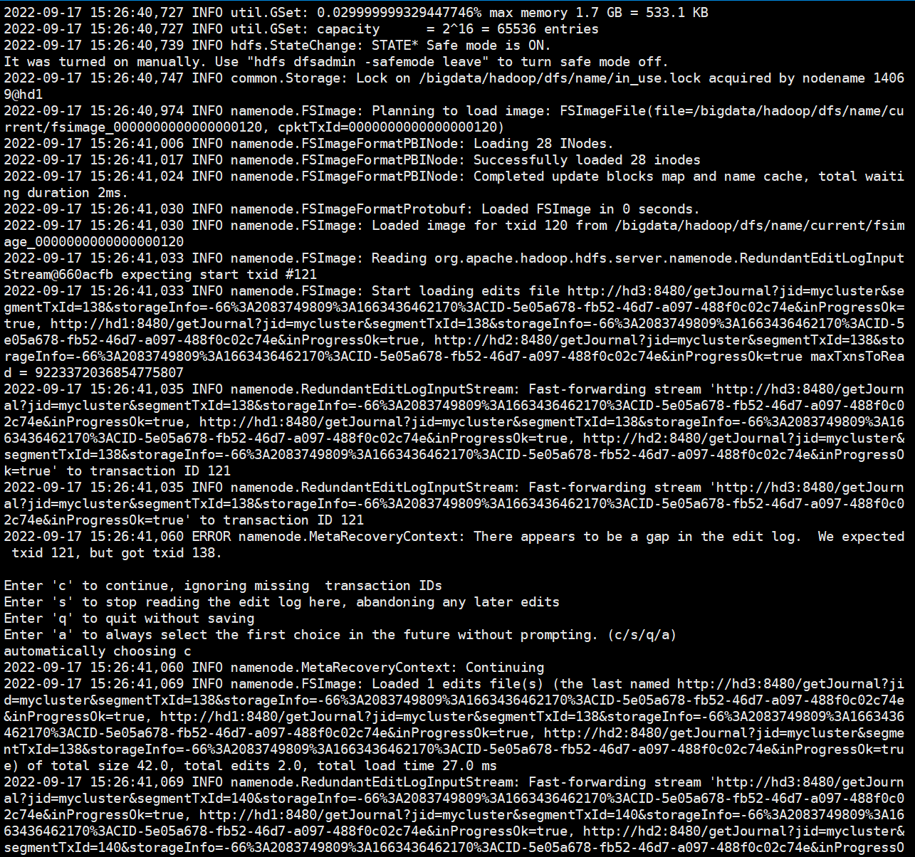使用HDFS的修复命令修复edits,实际上为自动从头遍历一次edits文件,当不存在时自动跳过,最终生成一份最新的fsimage文件,即可保证namenode正常启动。当edits文件比较多,数据量比较大时,会耗时较长:
