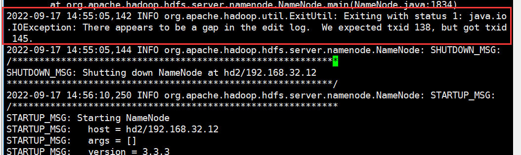There appears to be a gap in the edit log. We expected txid 138, but got txid 145.